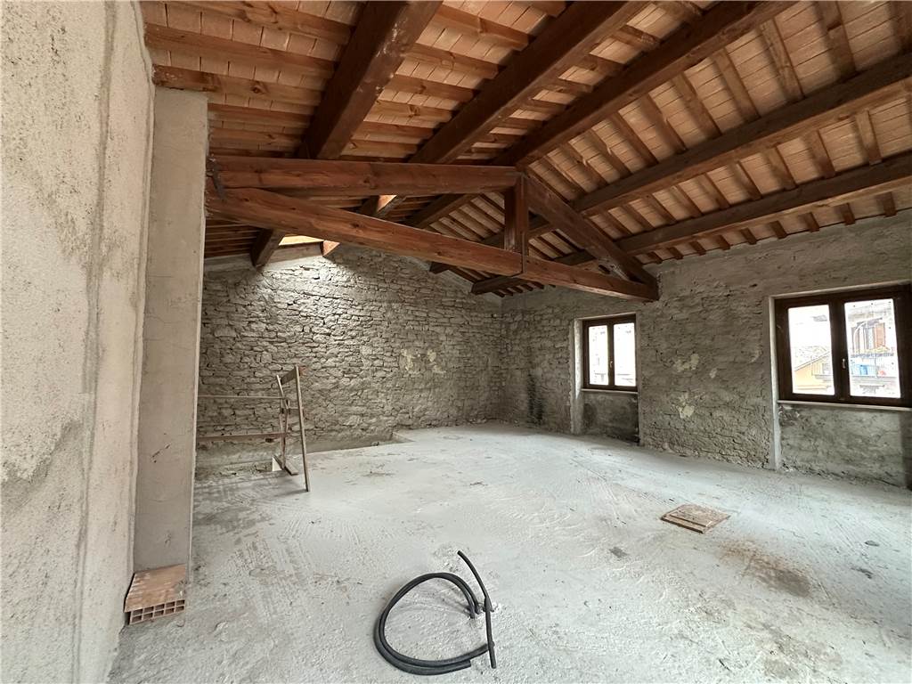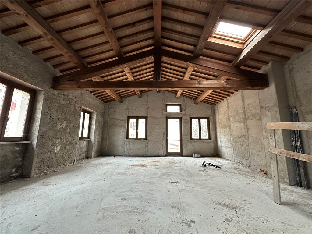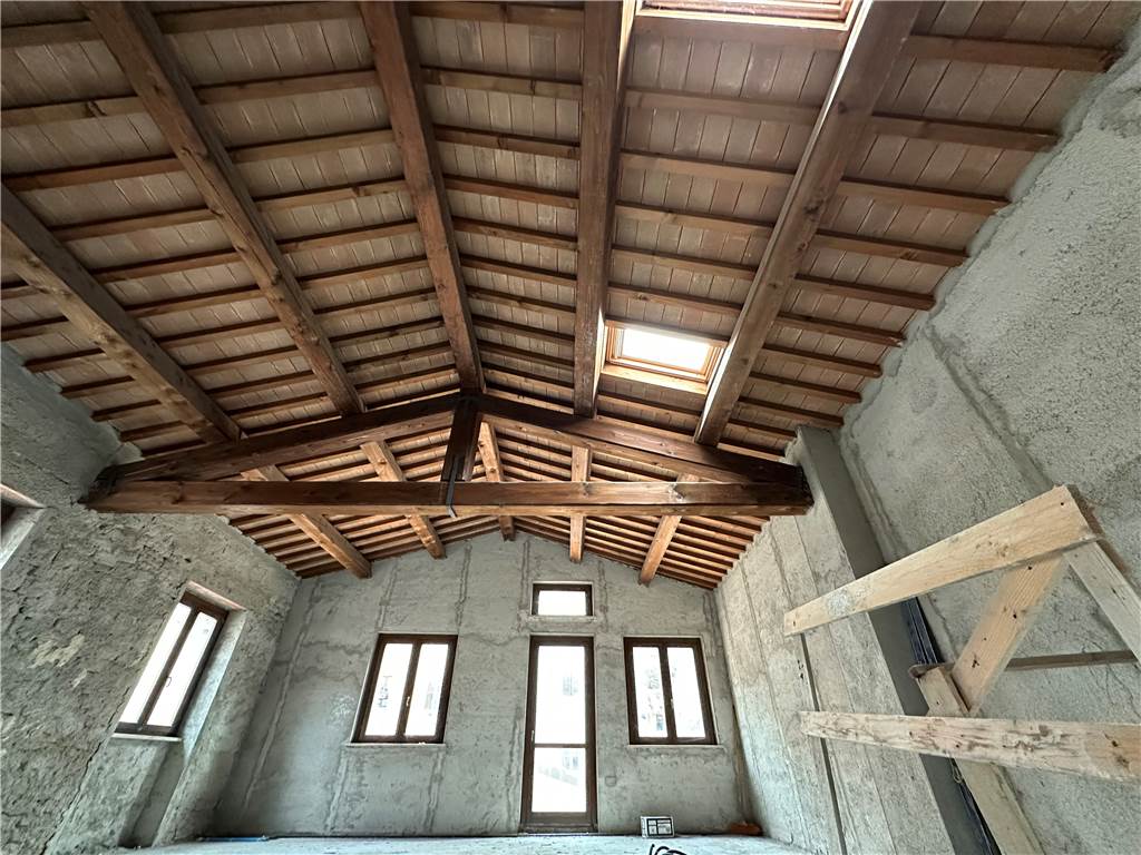 Dal disimpegno saliamo un piano e accediamo al piano primo, dove abbiamo un unico locale di ampia metratura, dove si possono ricavare due camere e un altro bagno. Caratteristica saliente di questo ambiente è il tetto, con capriate in legno, un muro in pietra e un solarium di oltre 40 mq.