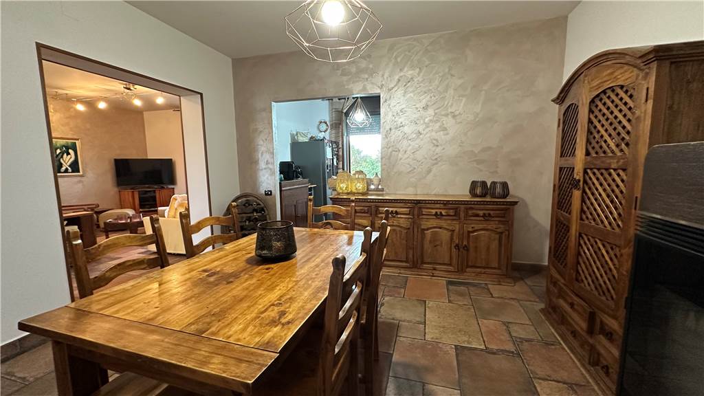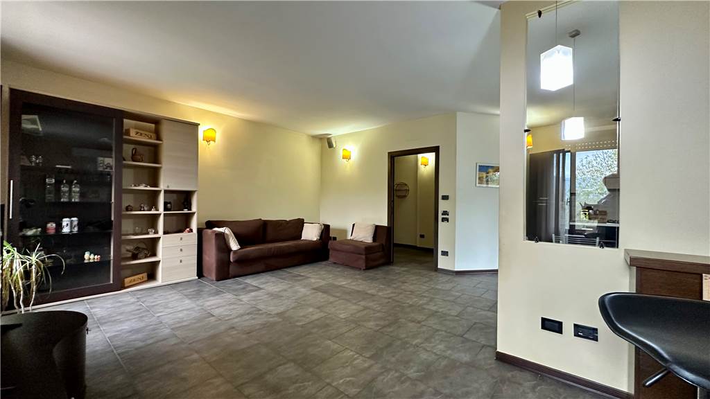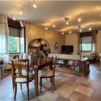 Da una scala esterna entriamo nell'appartamento del primo piano. Qui ci accoglie un salone con doppio accesso ed ampie aperture, sia dall'ingresso sia direttamente nella zona pranzo che è composta da cucina e tinello, terrazza che affaccia nel giardino.