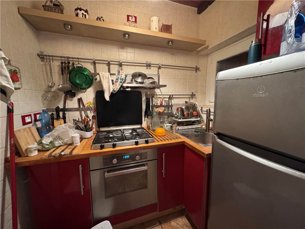 Il soggiorno è il cuore della casa: qui troviamo una caratteristica stufa a legna che, oltre a creare un ambiente intimo e suggestivo, alimenta anche l'impianto di riscaldamento. La cucina, con angolo cottura, si inserisce armoniosamente nella zona giorno.