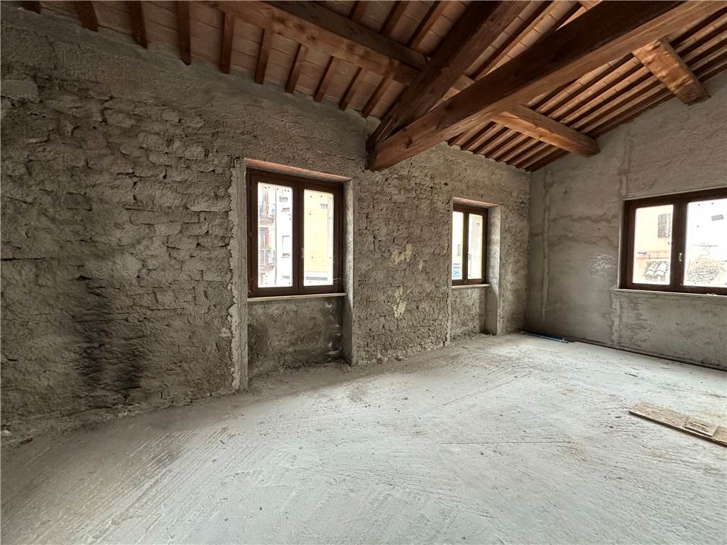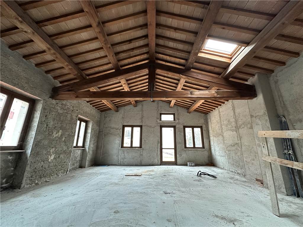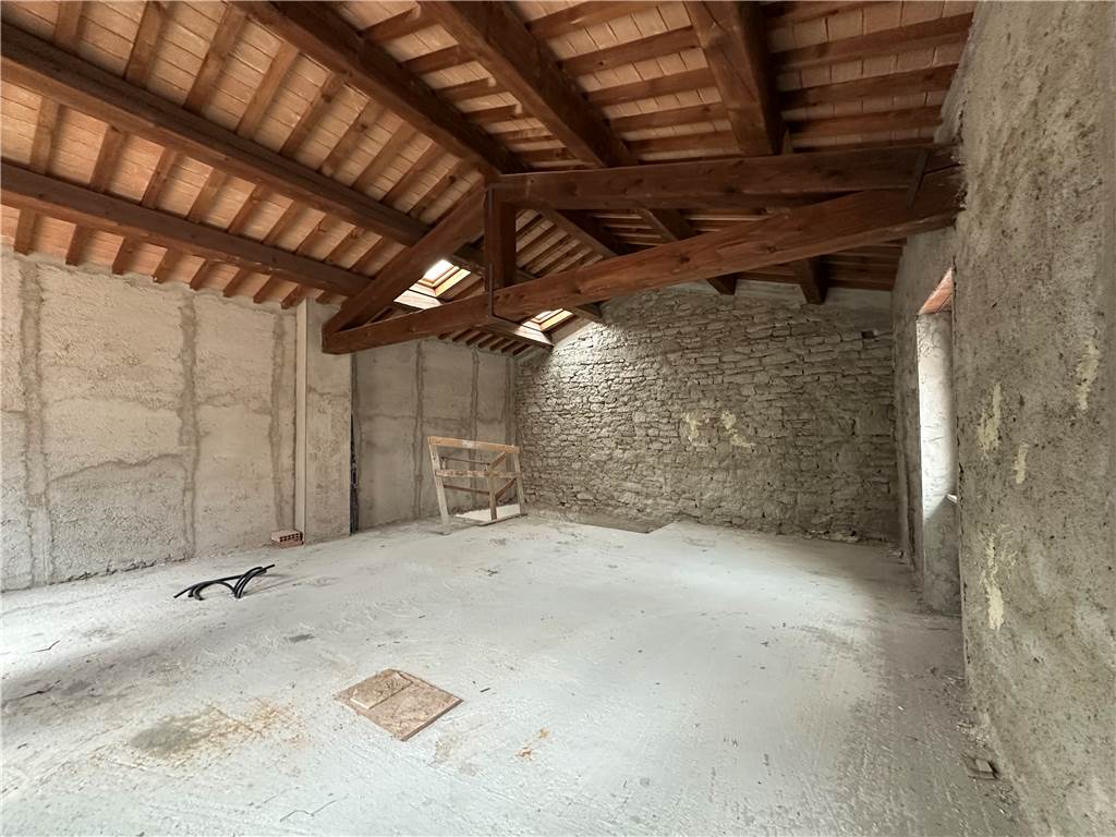 Dal disimpegno saliamo un piano e accediamo al piano primo, dove abbiamo un unico locale di ampia metratura, dove si possono ricavare due camere e un altro bagno. Caratteristica saliente di questo ambiente è il tetto, con capriate in legno, un muro in pietra e un solarium di oltre 40 mq.
