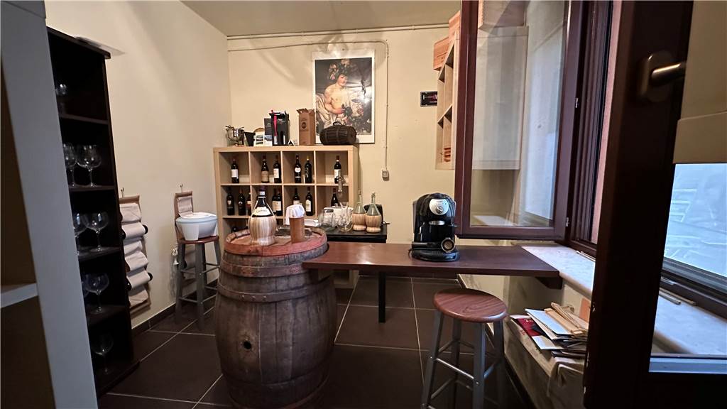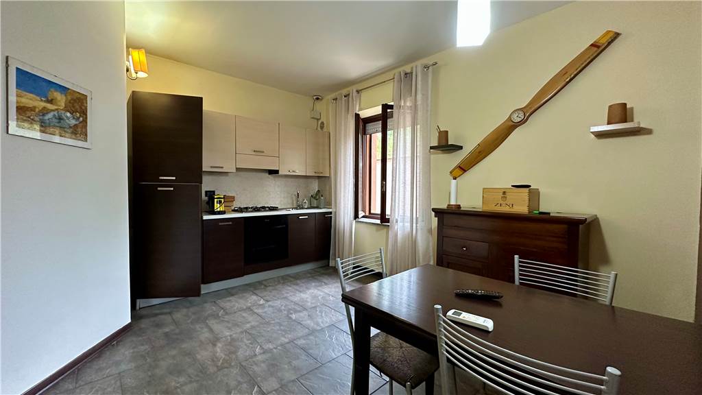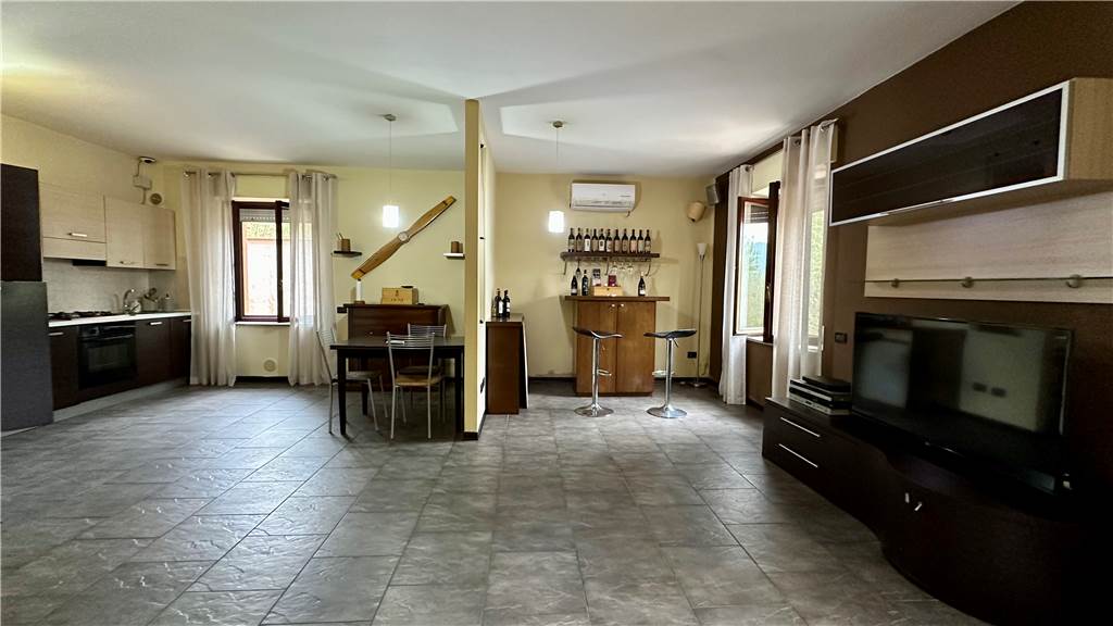 Da una scala esterna entriamo nell'appartamento del primo piano. Qui ci accoglie un salone con doppio accesso ed ampie aperture, sia dall'ingresso sia direttamente nella zona pranzo che è composta da cucina e tinello, terrazza che affaccia nel giardino.
