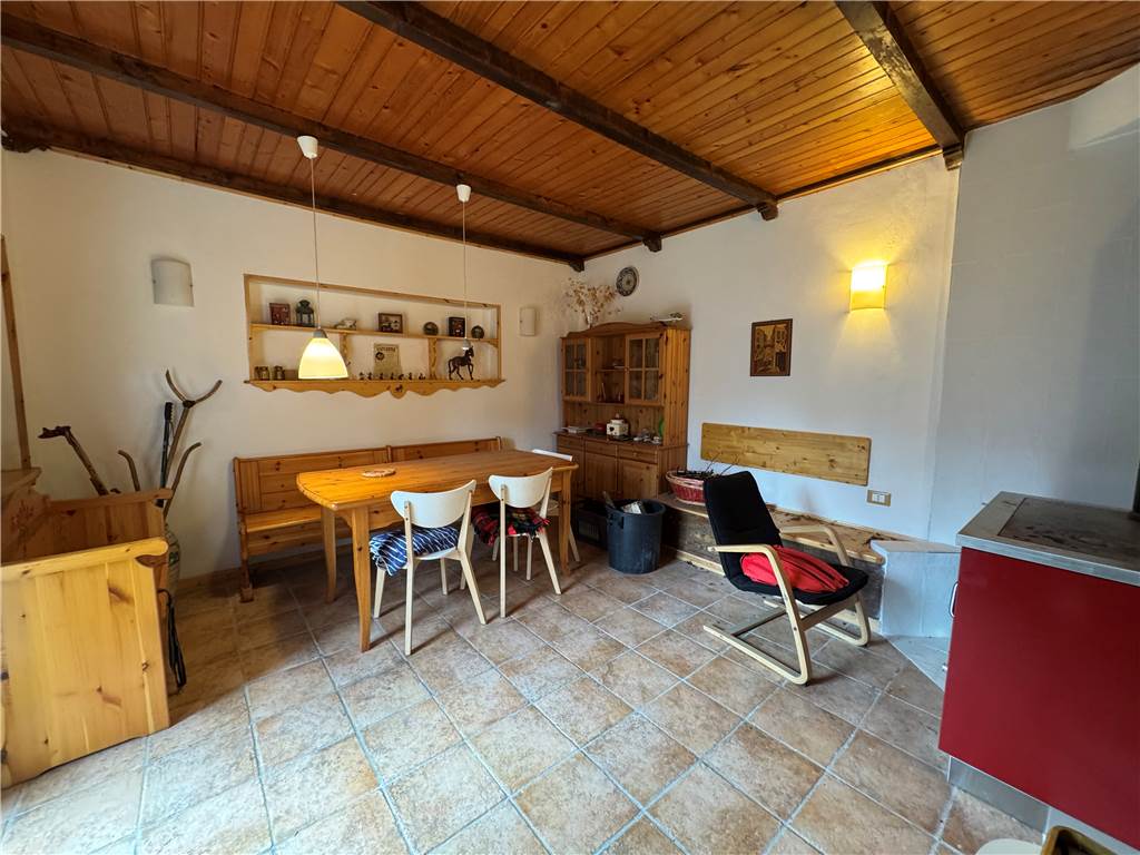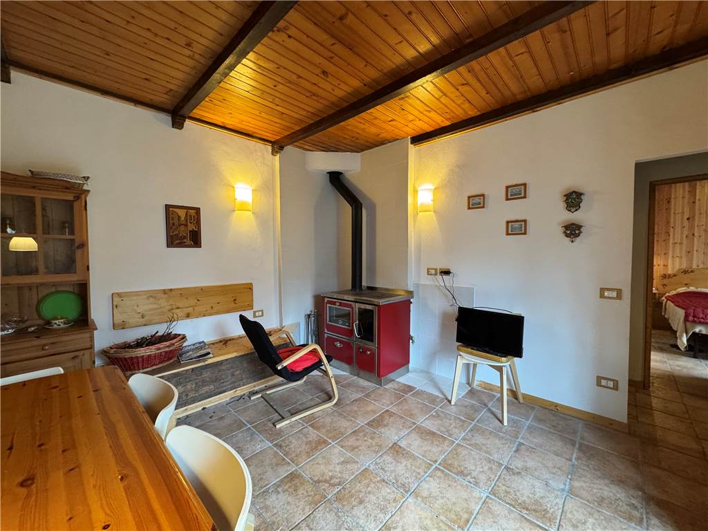 Il soggiorno è il cuore della casa: qui troviamo una caratteristica stufa a legna che, oltre a creare un ambiente intimo e suggestivo, alimenta anche l'impianto di riscaldamento. La cucina, con angolo cottura, si inserisce armoniosamente nella zona giorno.